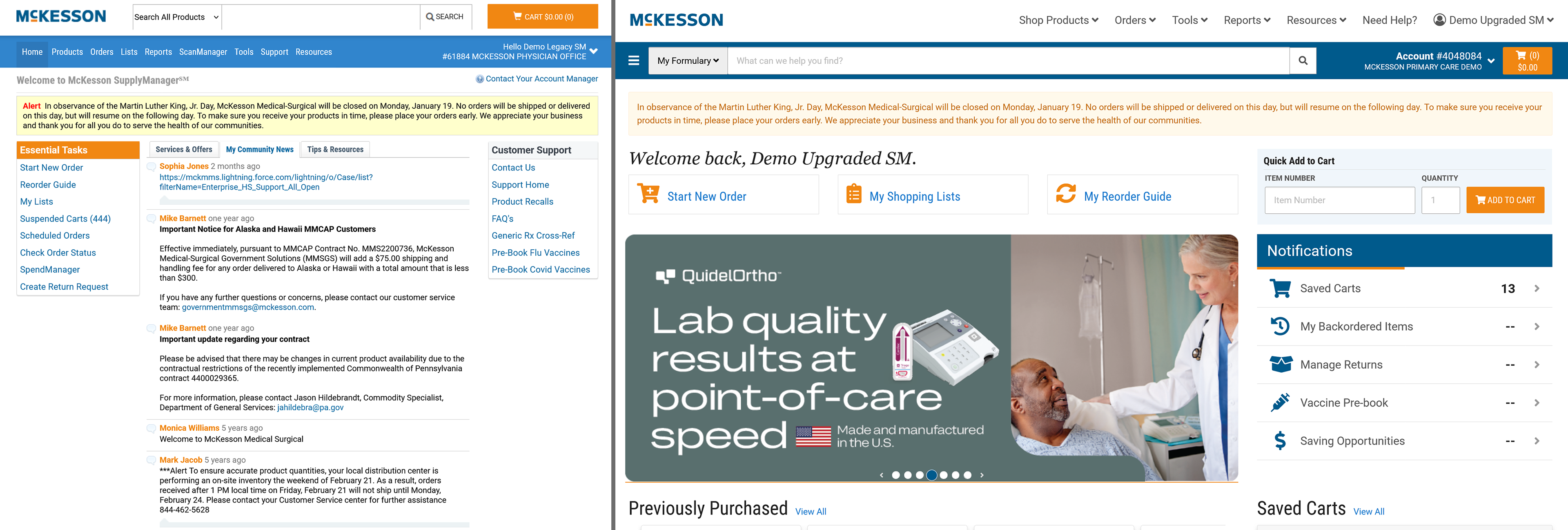 Work focused on assessing the customer experience during an active transition from a legacy e-commerce system to a modernized environment for medical supplies and equipment distribution.